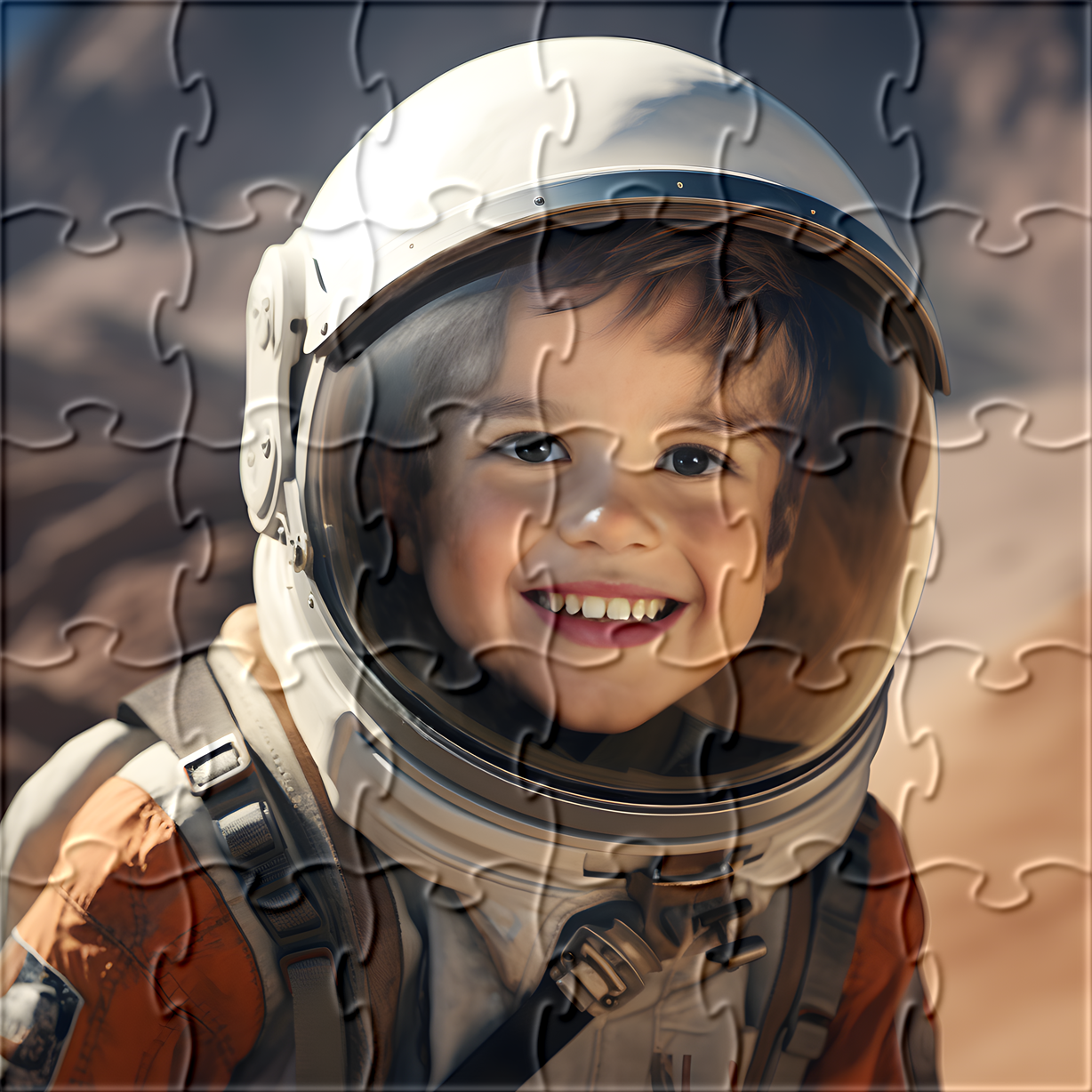 Turn your child into the hero of their own story with our personalised puzzle! Thanks to our digital artists, your child’s face will be seamlessly integrated into the design of the astronaut kid personalised puzzle with a martian ground, making their adventure feel more real than ever.