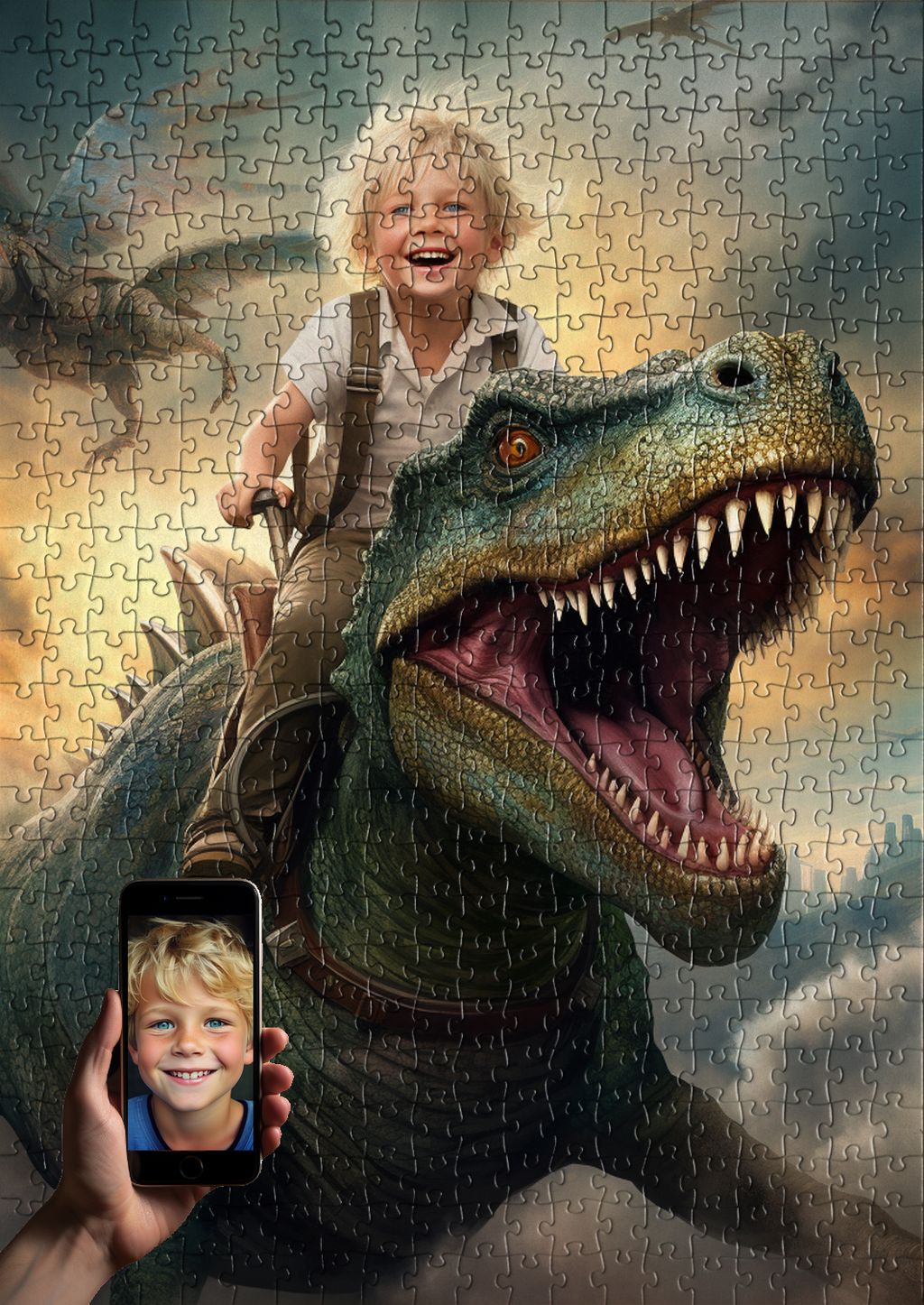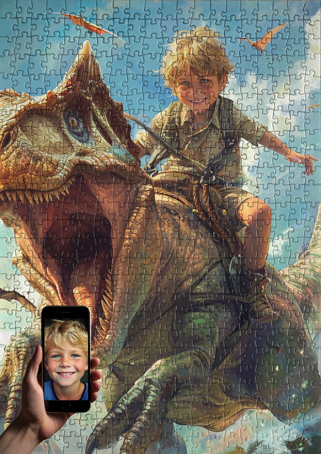 Turn your child into the hero of their own story with our personalised puzzle! Thanks to the work of our digital artists, your child’s face will be seamlessly integrated into the design of the child riding a dinosaur personalised puzzle in a prehistoric world, making their adventure feel more rea...