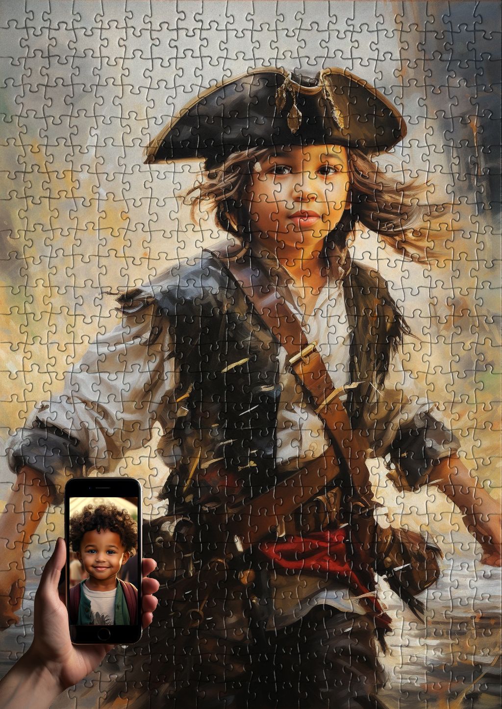 That is really one piece of great art! Is your child ready ready for a treasure hunt! He dreams to be a sea adventurer? This puzzle is for him! Turn your child into the hero of their own story with our personalised puzzle! Thanks to the work of our digital artists, your child’s face will be seaml...