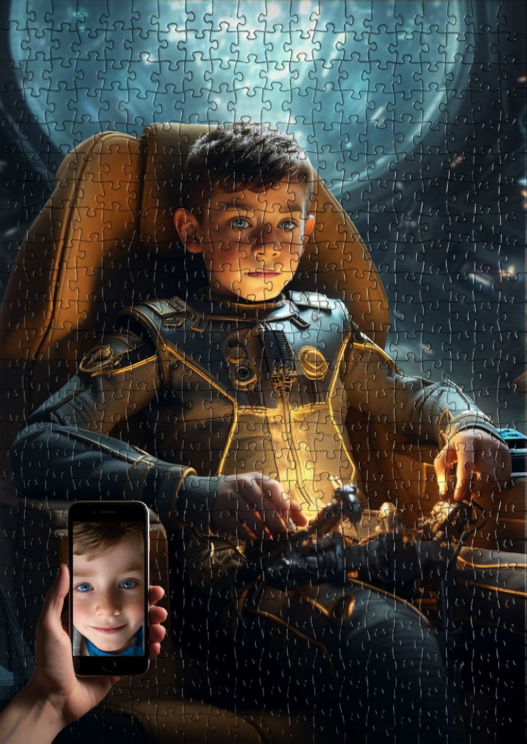 Turn your child into the hero of their own story with our personalised puzzle! Thanks to the work of our digital artists, your child’s face will be seamlessly integrated into the design a star officer boy in a sci-fi adventure, making their adventure feel more real than ever. How does it work? ...