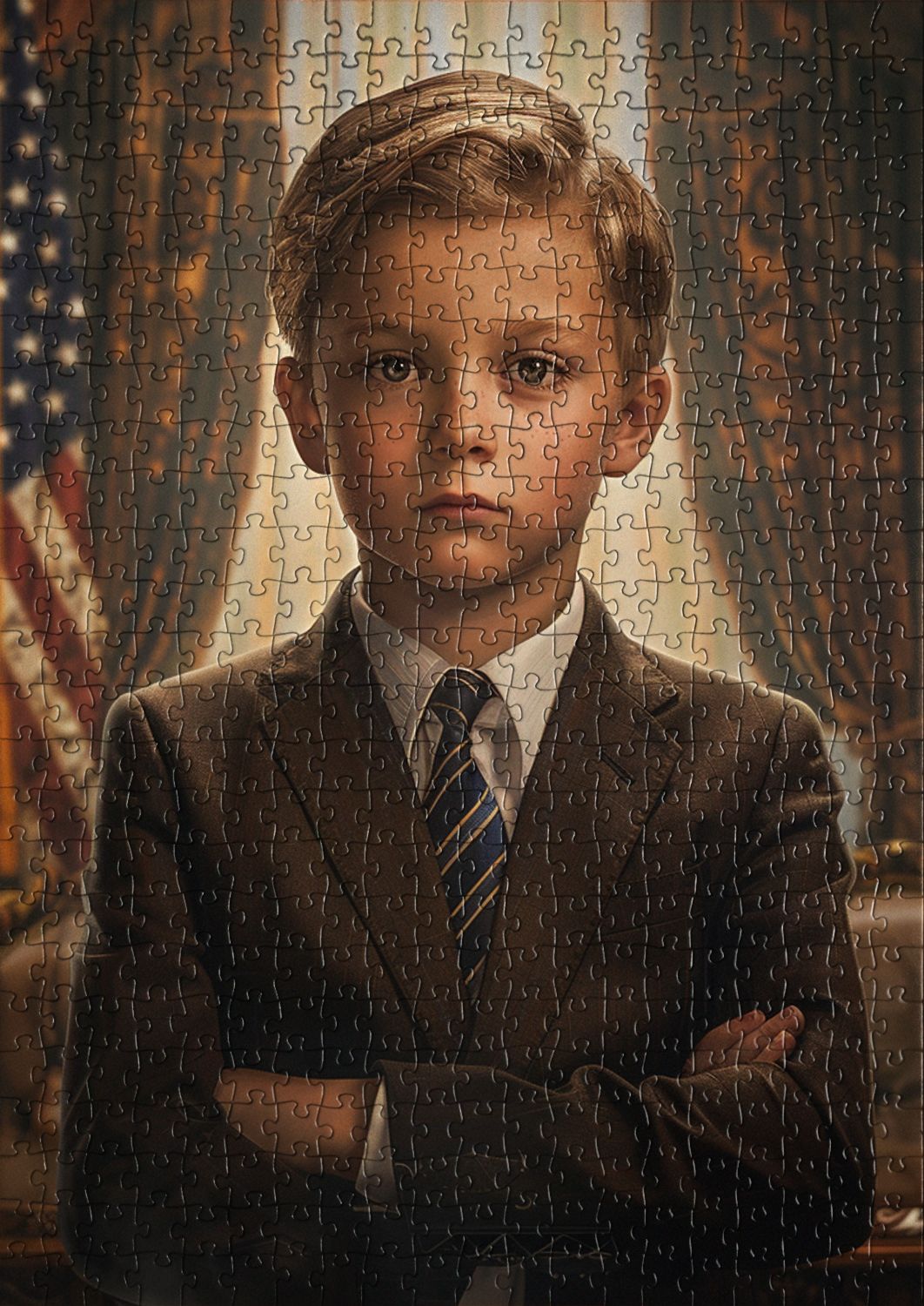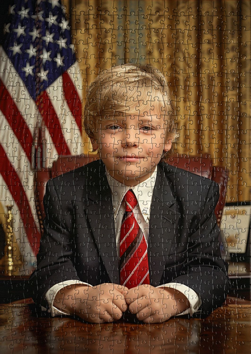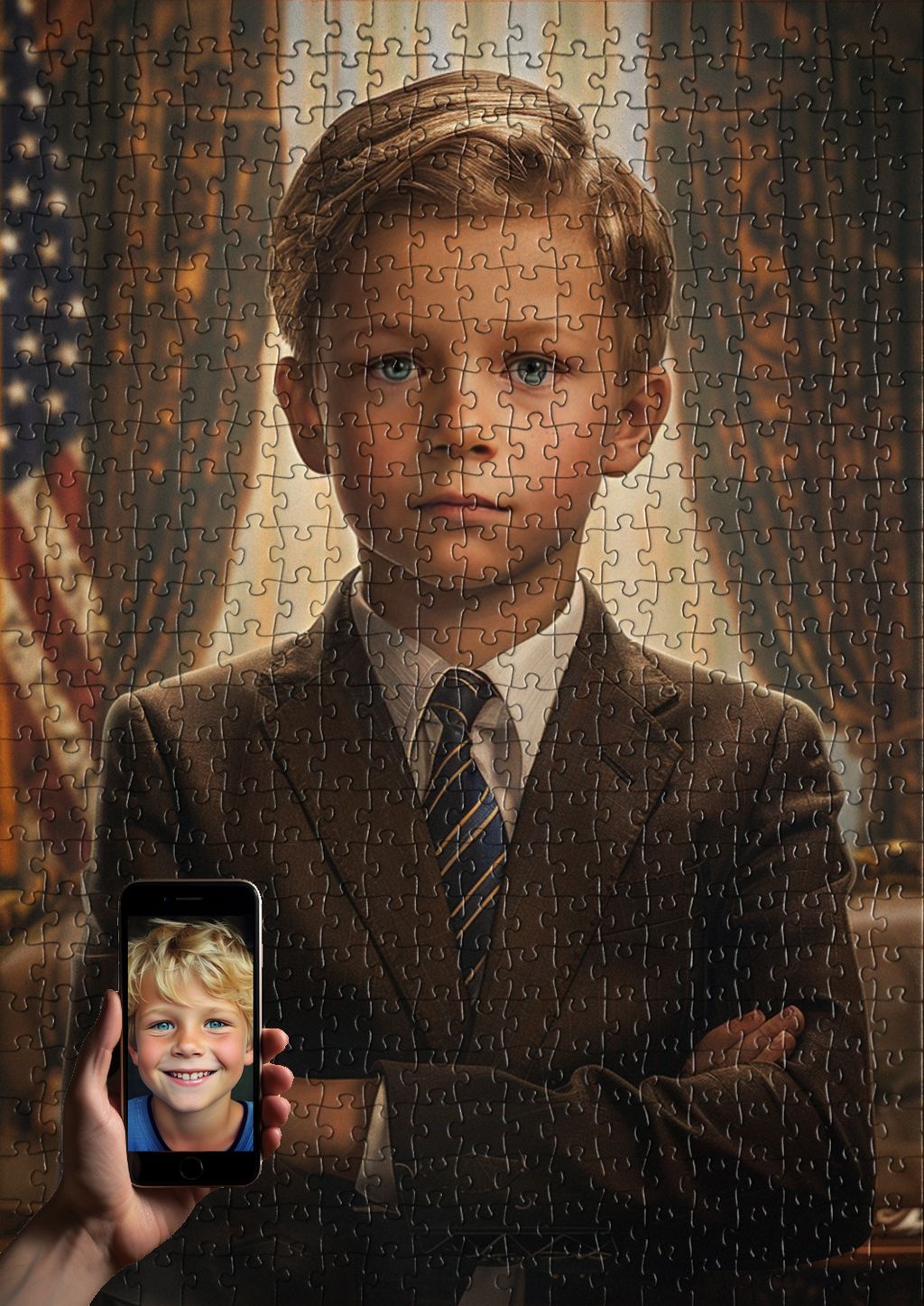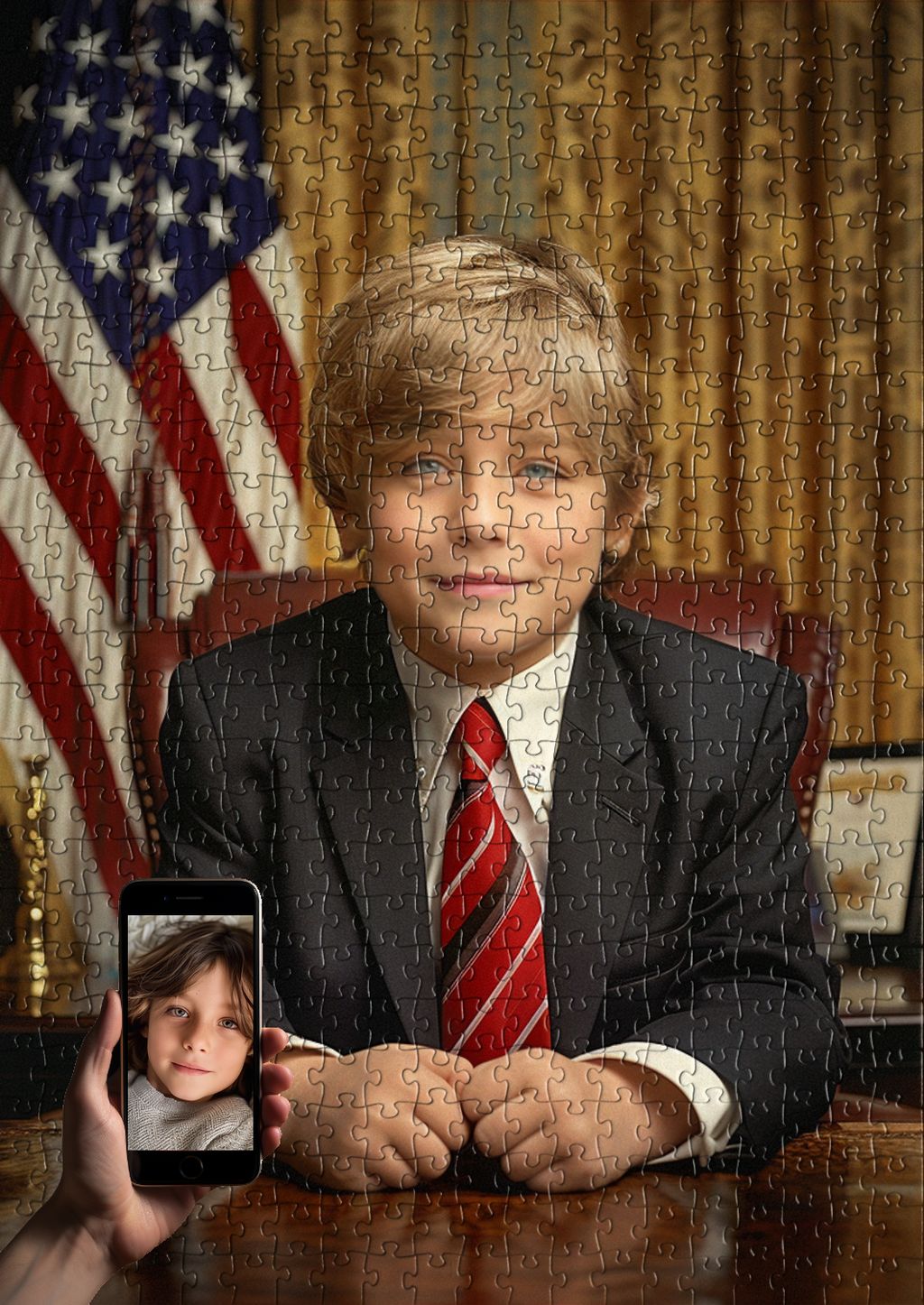 Is politics the main diner topic at home? Are you team Trump or Kamala? Turn your child into the hero of their own story with our personalised puzzle! Thanks to the work of our digital artists, your child’s face will be seamlessly integrated into a president boy personalised puzzle with curly hai...