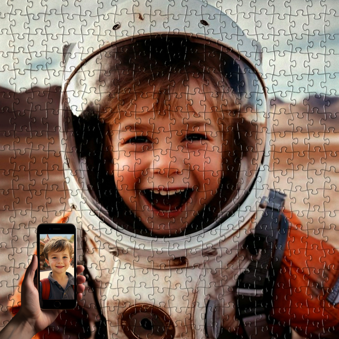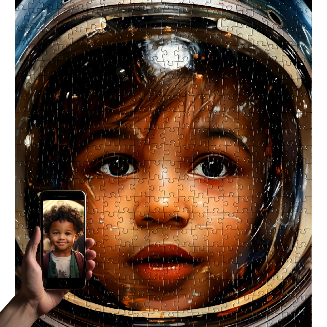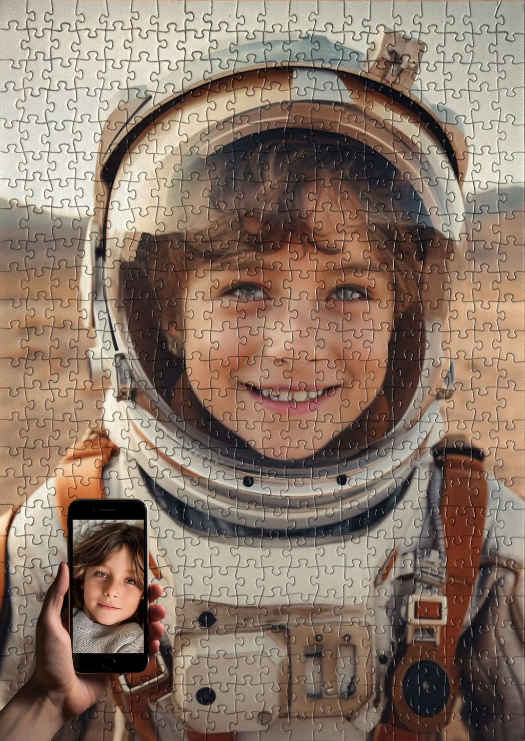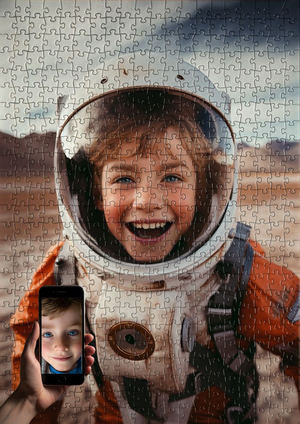 Turn your child into the hero of their own story with our personalised puzzle! Thanks to our digital artists, your child’s face will be seamlessly integrated into the design of the astronaut kid personalised puzzle with a martian ground, making their adventure feel more real than ever. How does ...