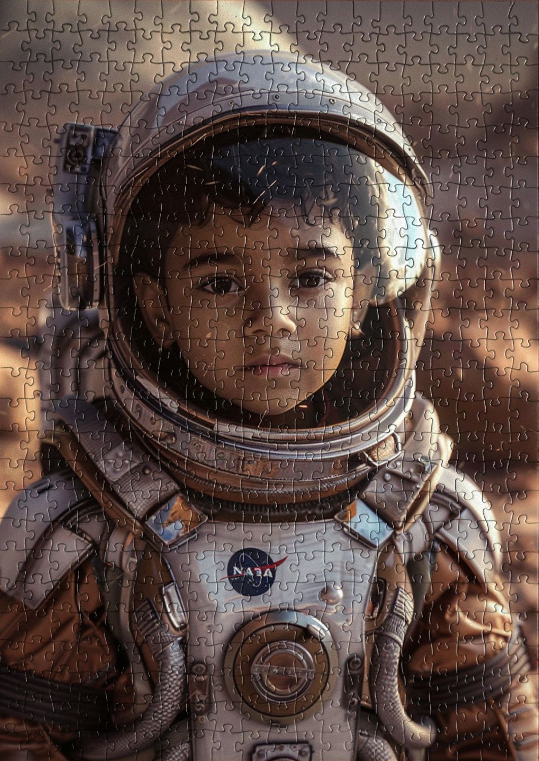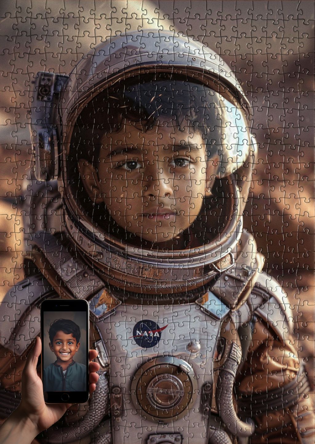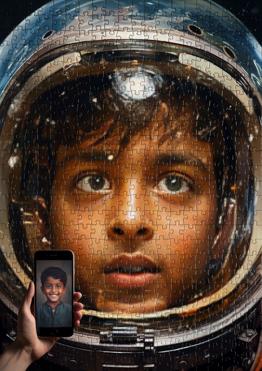 Turn your child into the hero of their own story with our personalised puzzle! Thanks to our digital artists, your child’s face will be seamlessly integrated into the design of the astronaut kid personalised puzzle with a martian ground, making their adventure feel more real than ever. How does ...
