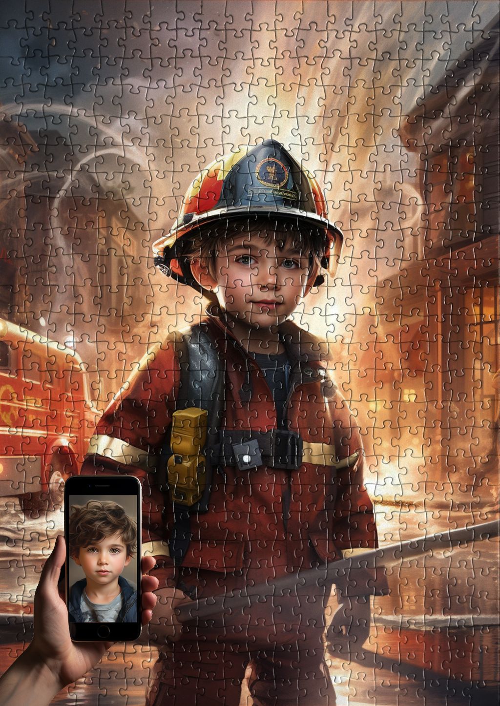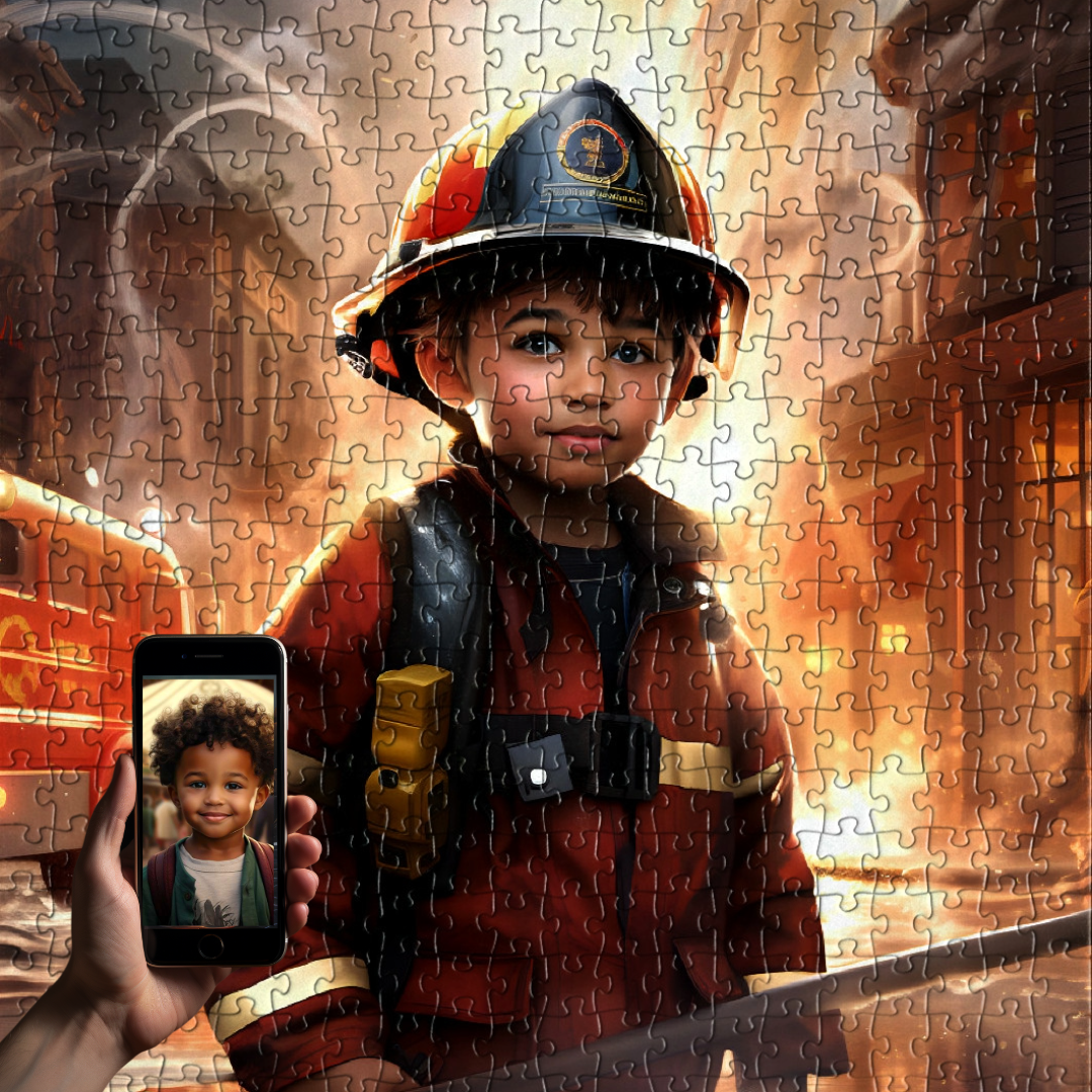 Turn your child into the hero of their own story with our personalised puzzle! Thanks to the work of our digital artists, your child’s face will be seamlessly integrated into the design of the kid firefighter personalised puzzle with flames in the background, making their adventure feel more real...