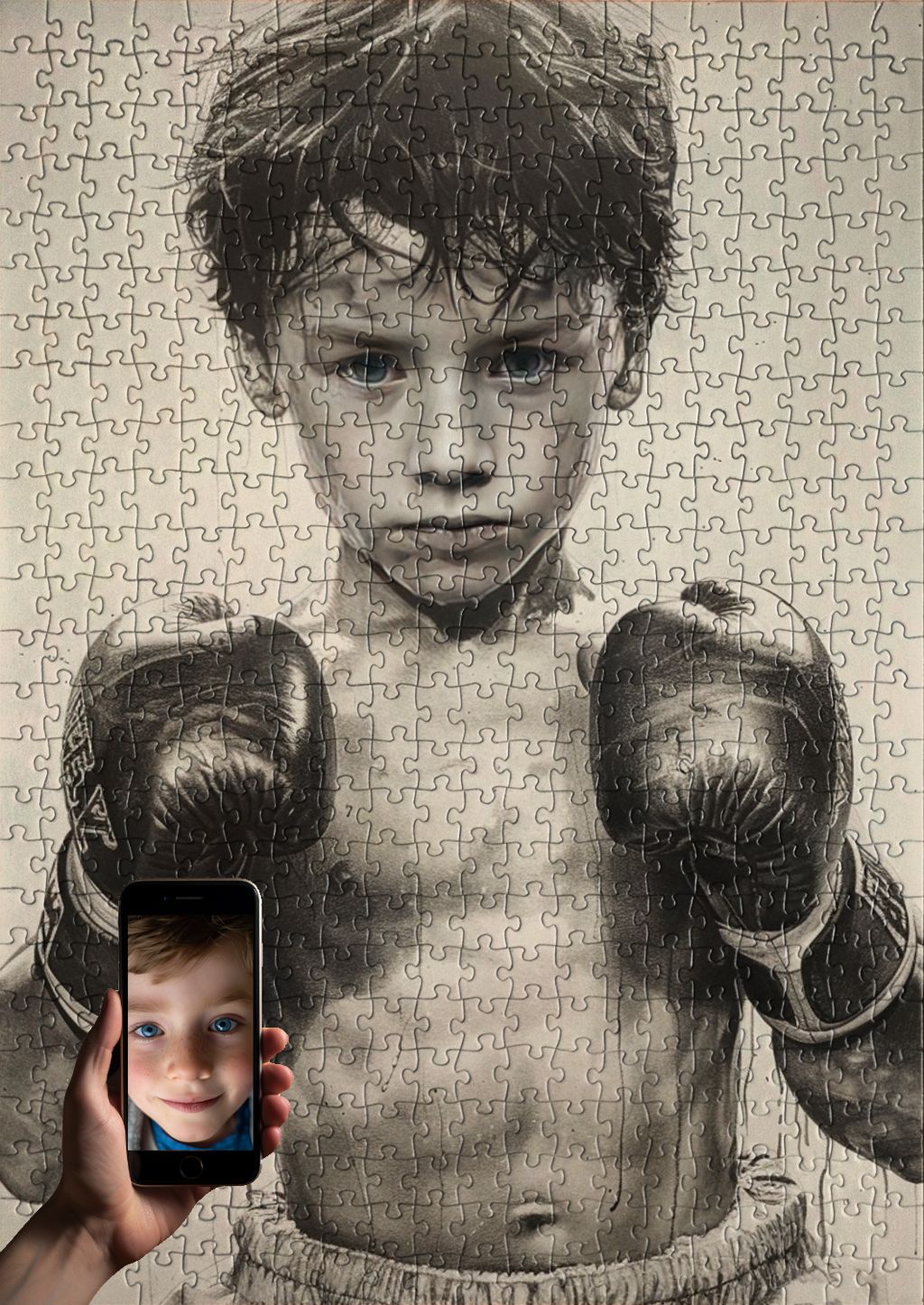 Is your child very serious about boxing? Is he a Rocky or a Tyson fan? Turn your child into the hero of their own story with our personalised puzzle! Thanks to the work of our digital artists, your child’s face will be seamlessly integrated into this black & white boxer personalised puzzle wi...